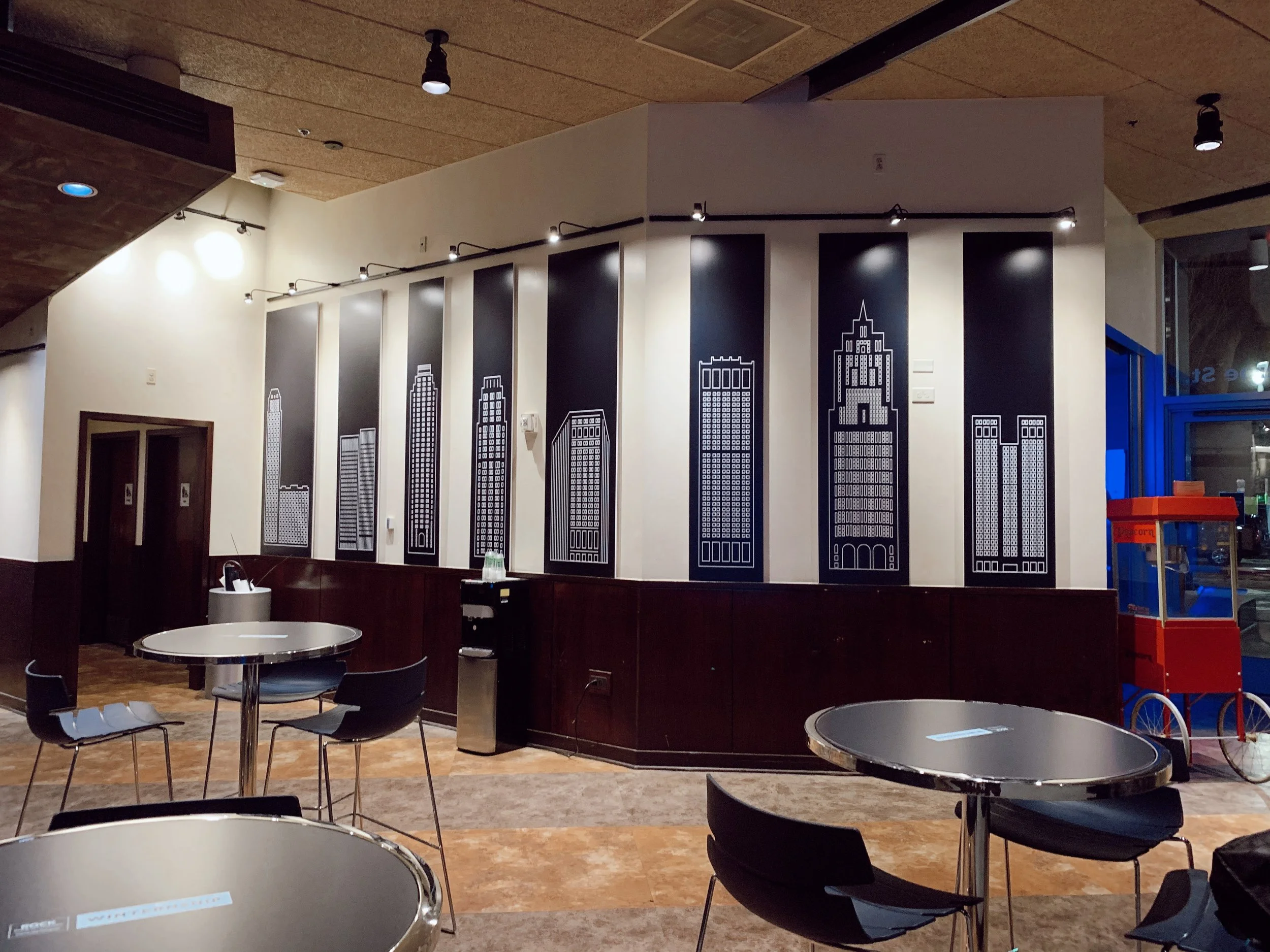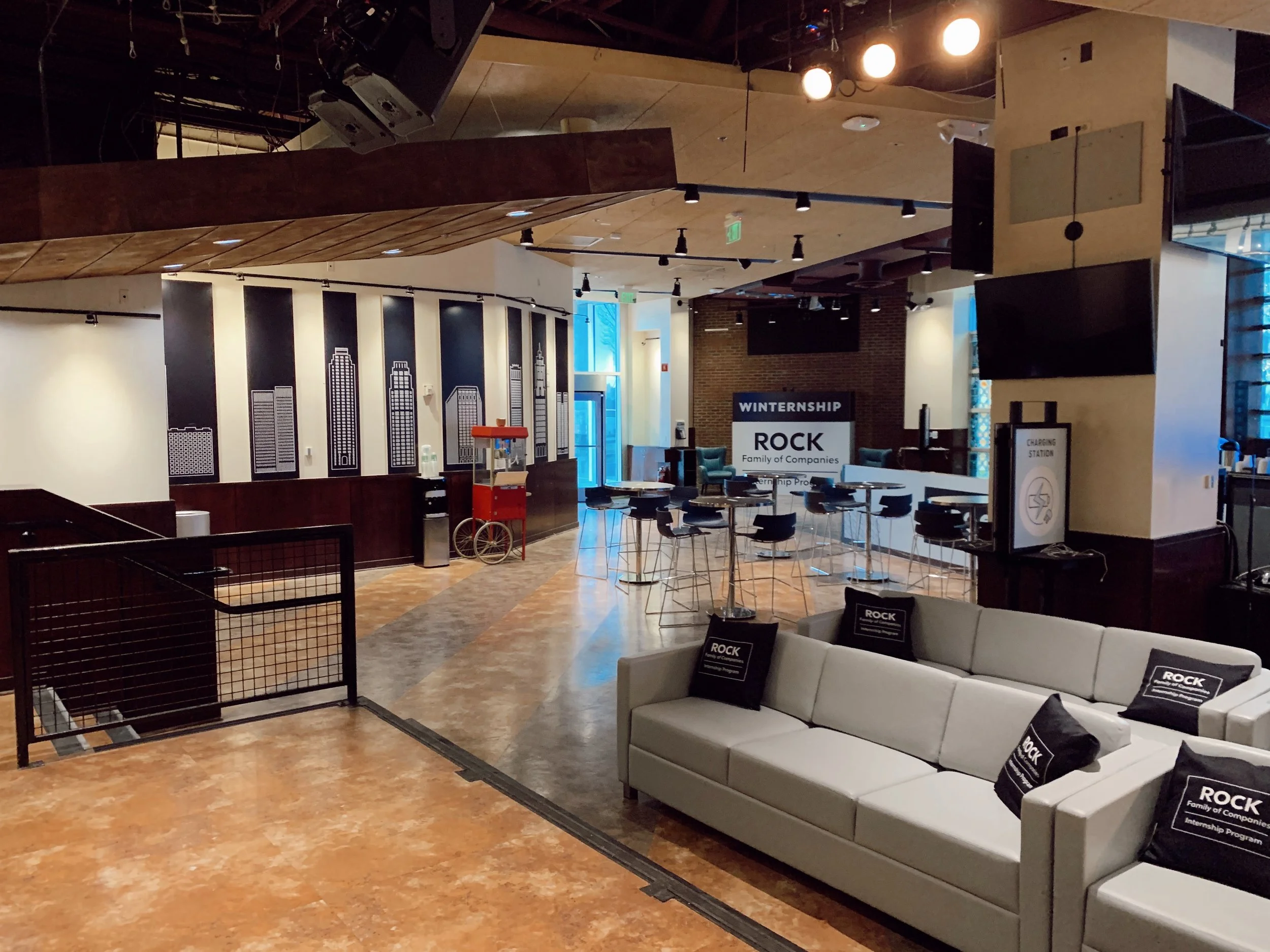 The Winternship Lounge was a collaborative home-base and lounge for winter interns of Rocket Companies. Formally a restaurant, the intern team wanted this space to be inviting and fun for interns to get to know each other, work and hangout. I pulled the blues from the intern color palette and created a co-working space complete with a color-drenched, cozy, blue lounge, a wrapped hot-cocoa bar, large-scale Winternship logo for a photo-op with friends, branded pillows facing the stage for lengthy meetings or annoucements and even created custom Detroit skyline illustrations to bring the cold outside, in.